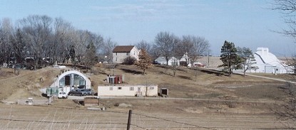 A view of our farm from the south-west...Steve and Teresa's earth-sheltered house and trailer are at the left, Wayne and Betty's home is at the top of the hill, and the corncrib/warehouse/milling room is at the right.